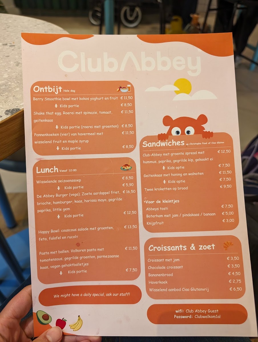 Welcome to Club Abbey, a delightful children's cafe located on Linnaeusstraat in Amsterdam. Here, every dish is crafted with care to cater to both kids and parents alike. Start your morning with vibrant kokosyoghurt topped with fresh berries for €10, or indulge in a classic croissant with jam for just €3.50.